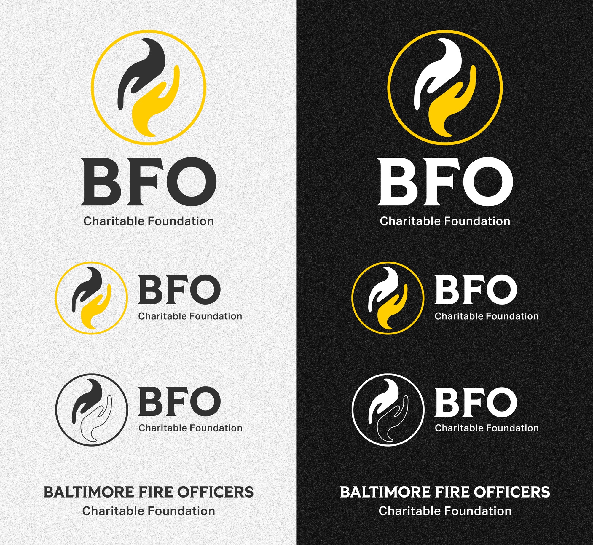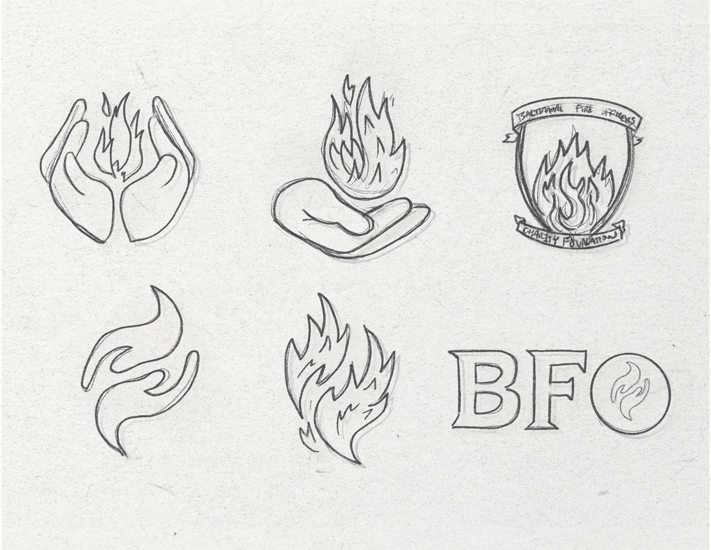 One image from the sketches that seemed to catch everyone's attention was the 2 hands resembling a flame. I liked the simplicity of it and that it merged a symbol for care (helping hands) with the flame icon. I worked on developing out how it would work as both an icon on it's own, and paired with a wordmark / initials for the organization. I chose 2 fonts that worked well together, one that felt like it fit with a fire department for BFO, and a clean, sans-serif font for "Charitable Foundation."
