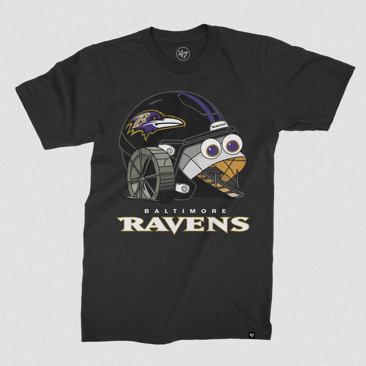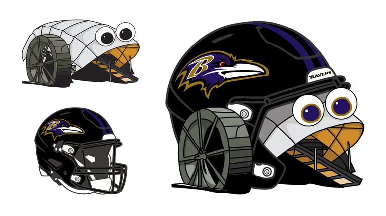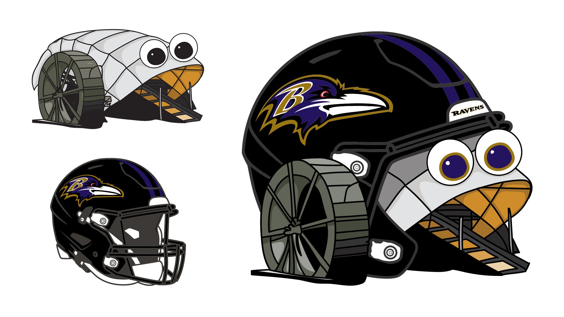 Mr. Trash Wheel's existing character logo, Ravens helmet mark & final co-branded logo.