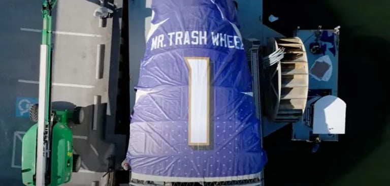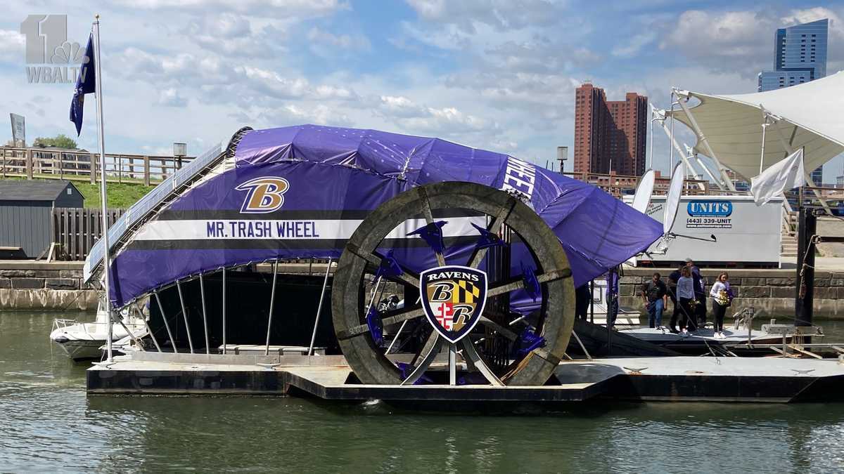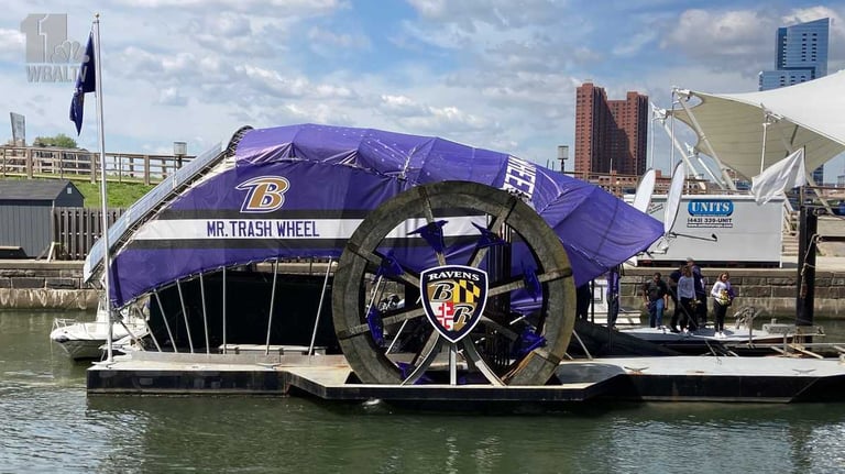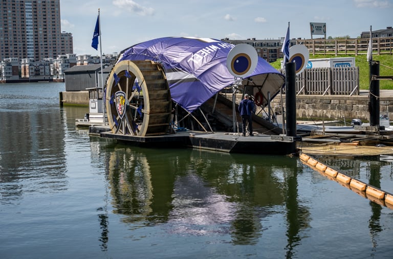 3 views showing Mr. Trash Wheel's new uniform and branding, which included updated Purple and Gold googly eyes, a custom purple jersey wrap with his nameplate and #1, and an aluminum Ravens shield with a flock of ravens that fly around in a circle as the water wheel turns. Photo credits: Baltimore Banner & WBAL TV 11.