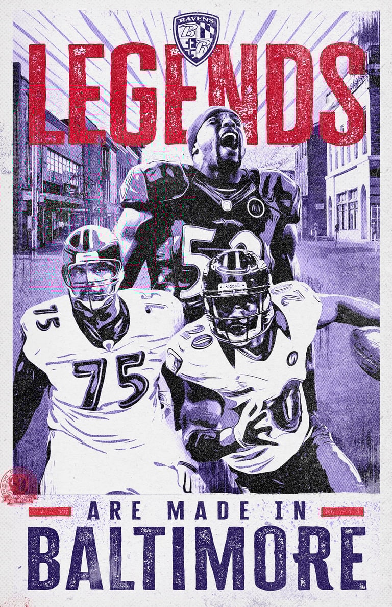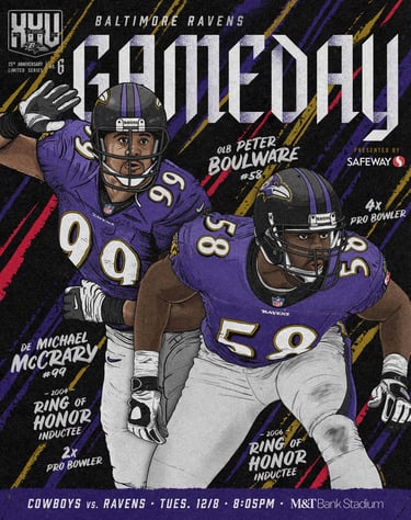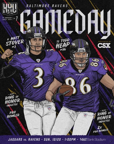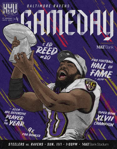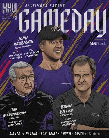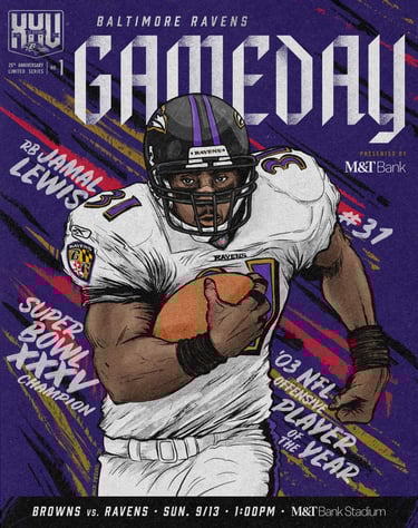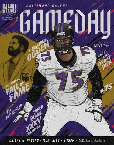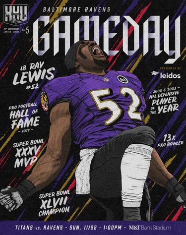 For the start of the 25th season, I pitched an idea to do a series of illustrations of notable players from the Ravens' 25 years for the cover art of the Gameday programs. It was a lot of work, but a very rewarding challenge. I especially enjoyed getting to do a deep dive on the uniform elements that were specific to each of the player's eras. The cover art got a great reception, even from some of the legends who were depicted, and we went further and released a limited edition print of these covers as posters too.