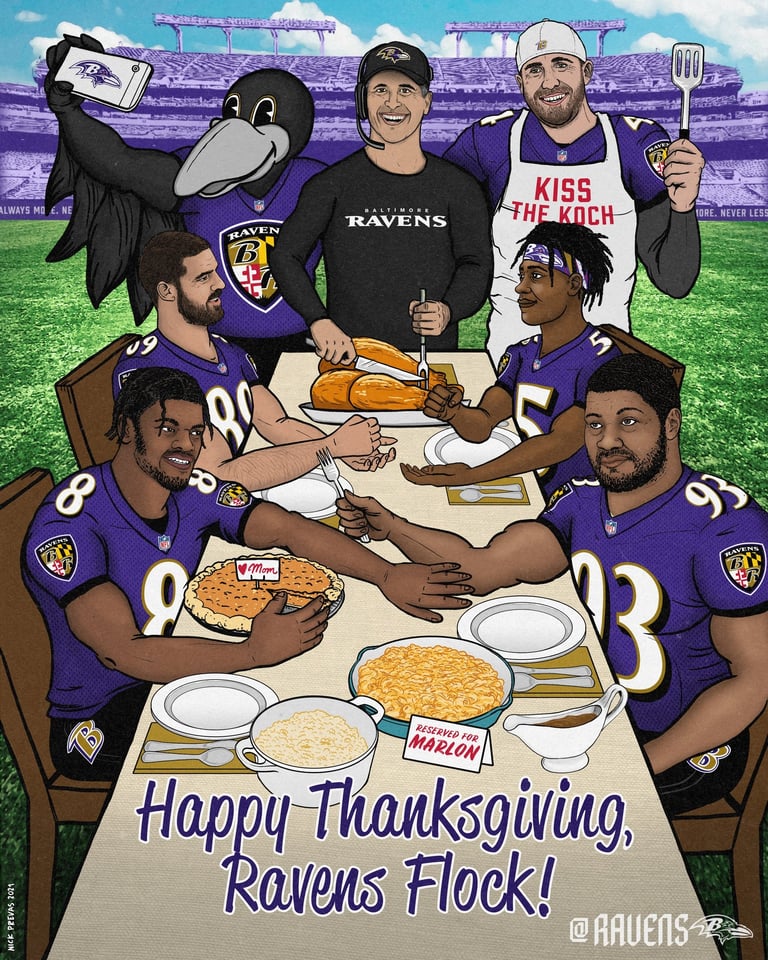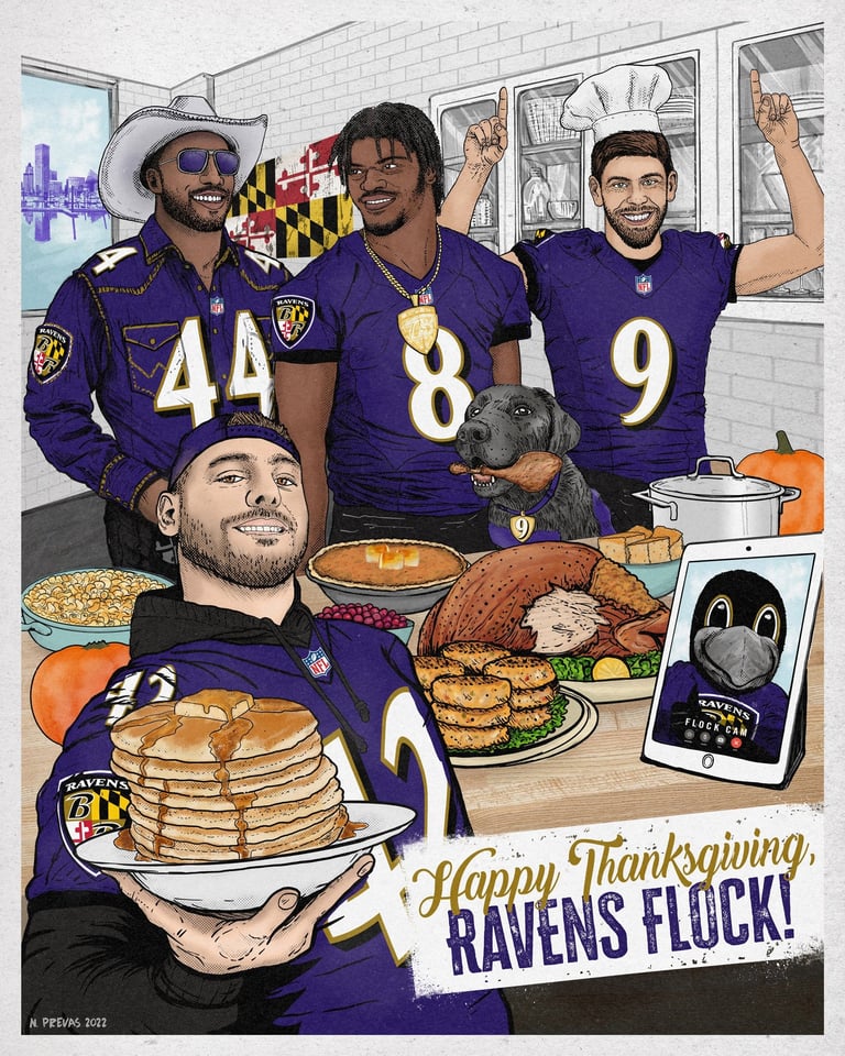 Starting in the 2020 season, I produced a holiday themed illustration for @Ravens social accounts. For the next few years I continued to create a variety of holiday illustrations featuring current players, our (then) head coach, and some other characters that the Flock would recognize.